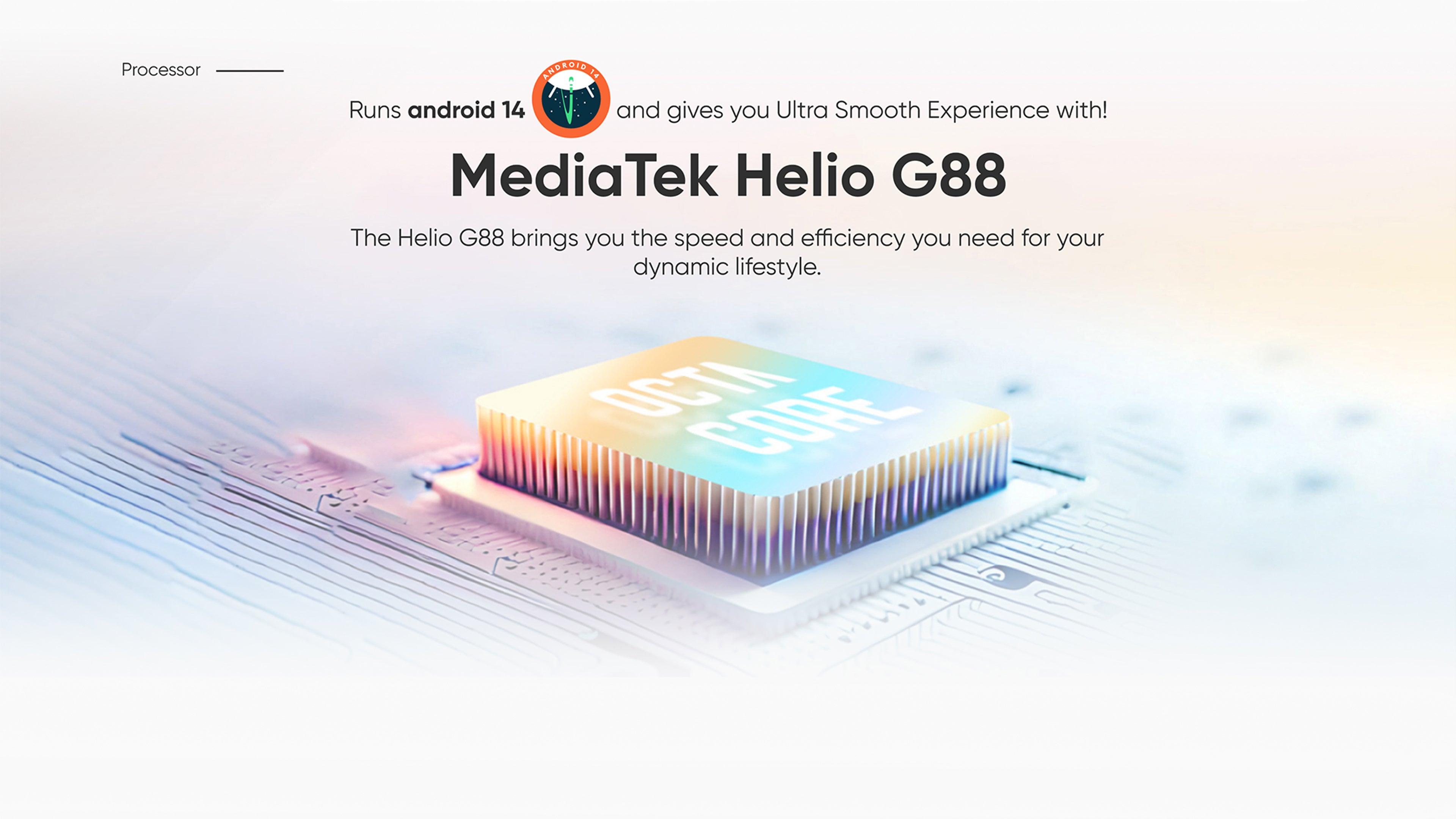 - Processor: 2GHz Octa core, Mediatek Helio G88